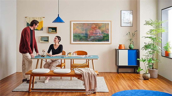 对于崇尚生活美学之道的群体而言,客厅中的每一件陈设都在传递主人的审美主张,而电视作为视觉焦点,直接奠定了空间的格调底色。The Frame画壁艺术电视可谓墙面美学的重塑者,24.9mm(65英寸机型)纤薄机身搭配专属贴合壁挂架,展现出画廊珍品般的精致质感。可更换磁吸式艺术边框实现一框焕新客厅气韵的美学升级,柚木色适配日式侘寂风、简约白呼应现代轻奢、复古棕契合摩登潮流。更显匠心的是极简隐形线缆设计,所有连接线均被收纳于集线盒中,墙面自此告别杂乱,仅留纯粹画面与留白空间。The Serif画境艺术电视更是设计师美学的具象表达,标志性云白色“I”型框架由知名设计师罗南·布鲁克与埃尔文·布鲁克打造,无论置于书房还是客厅,都能与场景无缝融合。顶部的置物台更精准契合人们对生活仪式感的追求,春日点缀一支鲜切郁金香,冬日安放一盏香薰烛台,让电视成为承载仪式感的情绪媒介。